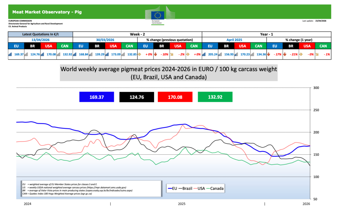 На німецькій біржі VEZG на наступний тиждень ціни на напівтуші кондиційних свиней – 1,70 € євро/кг (87,38 грн/кг), на напівтуші свиноматок – 0,83 євро/кг (42,66 грн/кг). Ціни вказані без ПДВ.